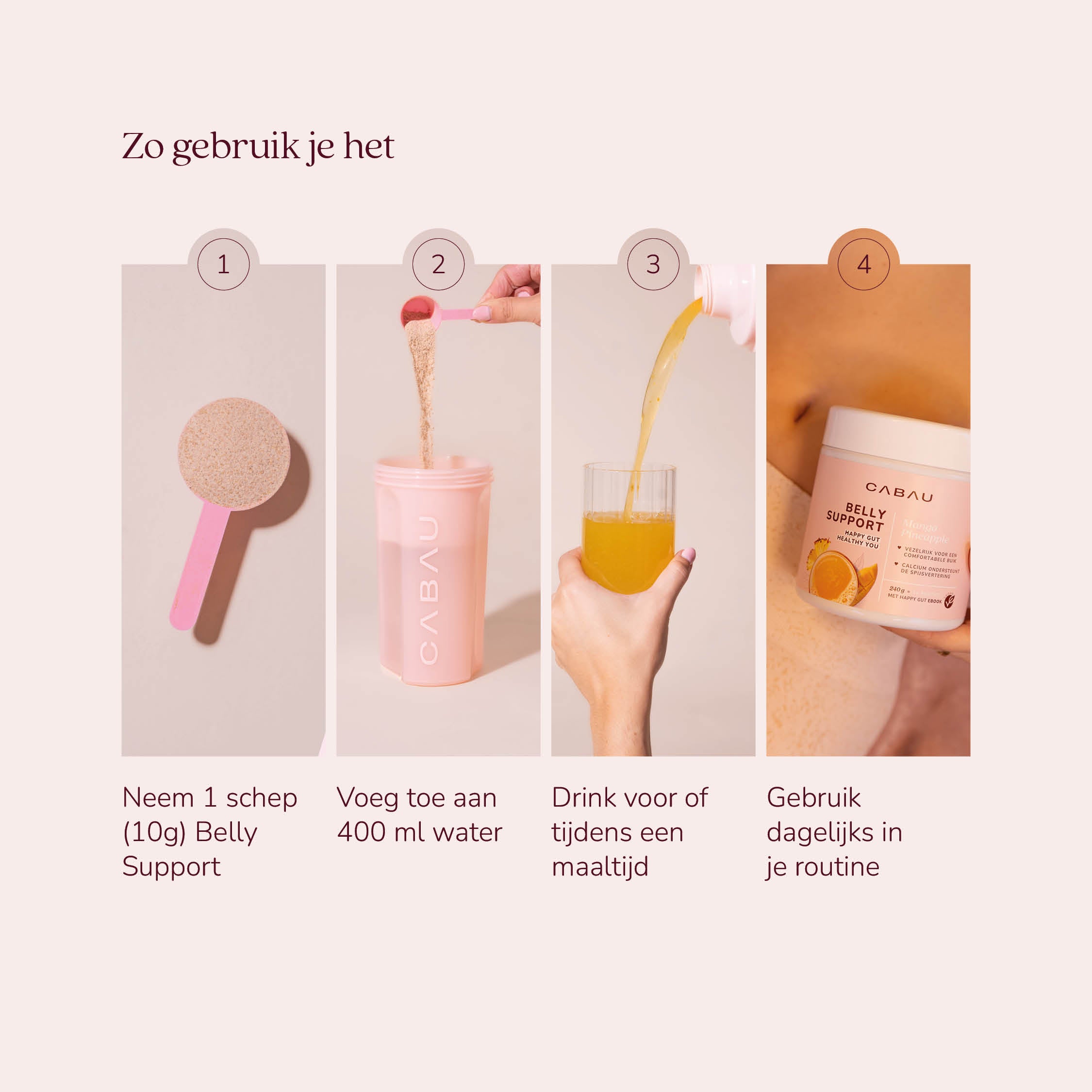 Gebruik dagelijks één maatschep (10 gram) Belly Support, bij voorkeur tijdens of net voor een maaltijd. Zo worden de ingrediënten optimaal opgenomen. Je kunt het poeder mengen met een glas water, of toevoegen aan je smoothie of sapje – net wat bij jouw routine past.