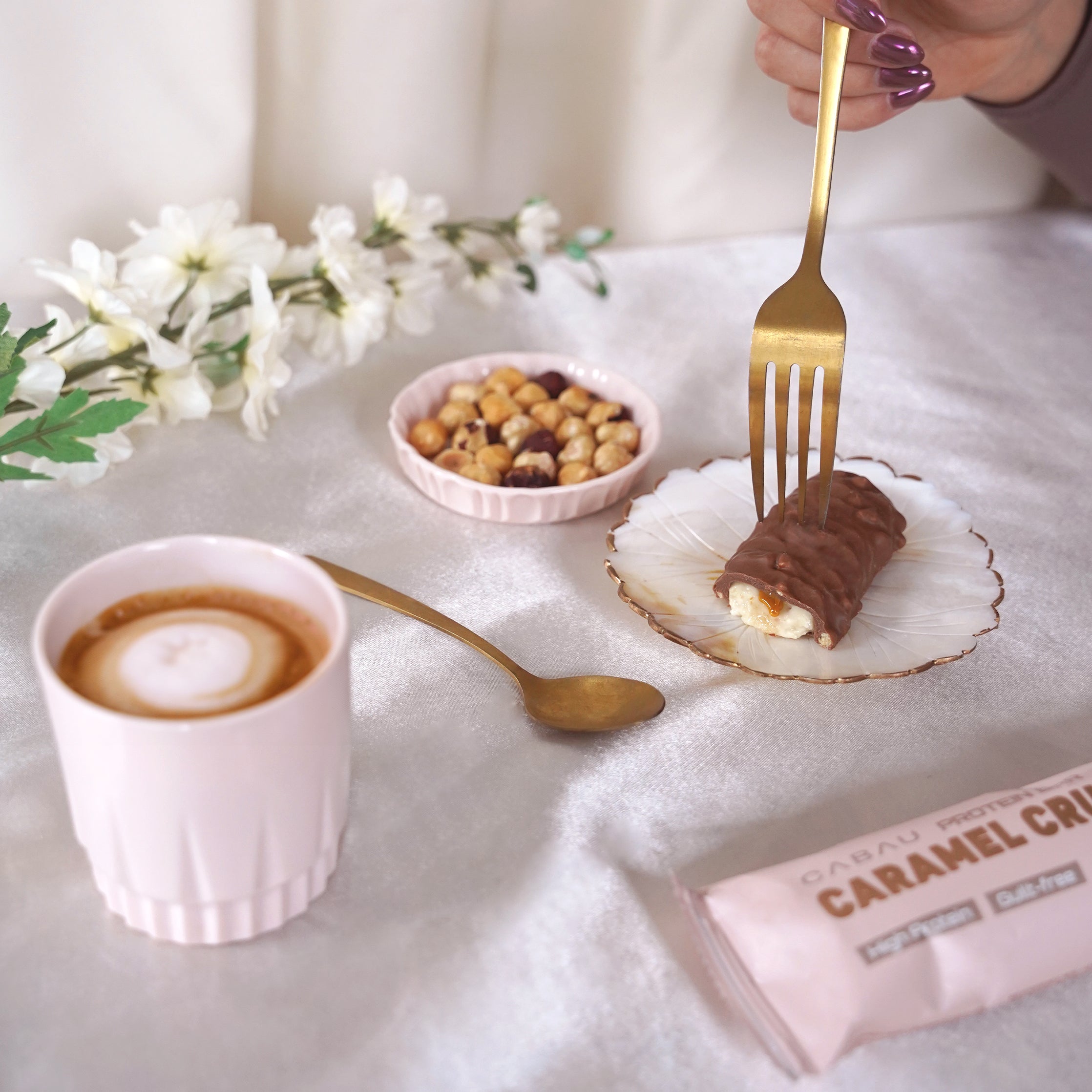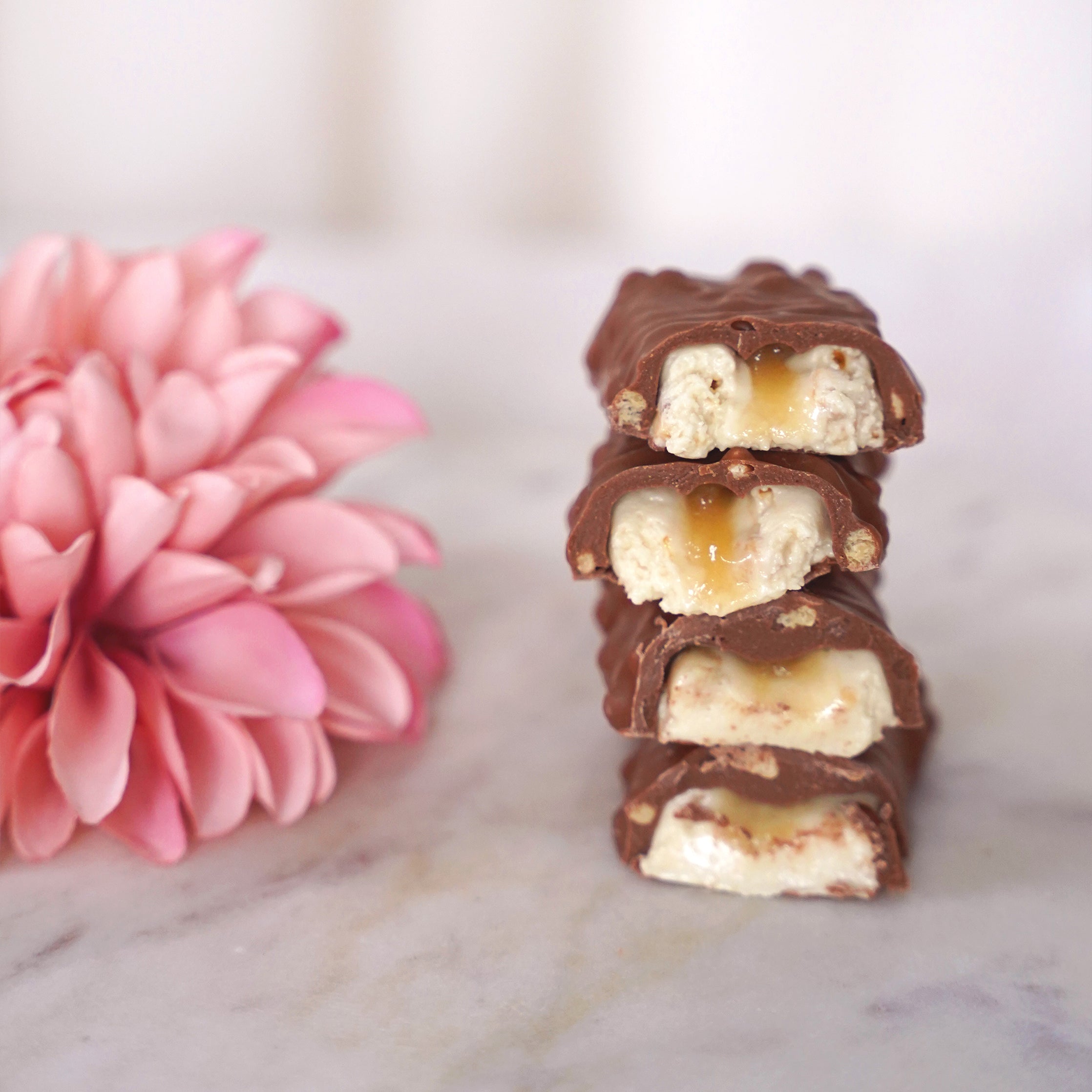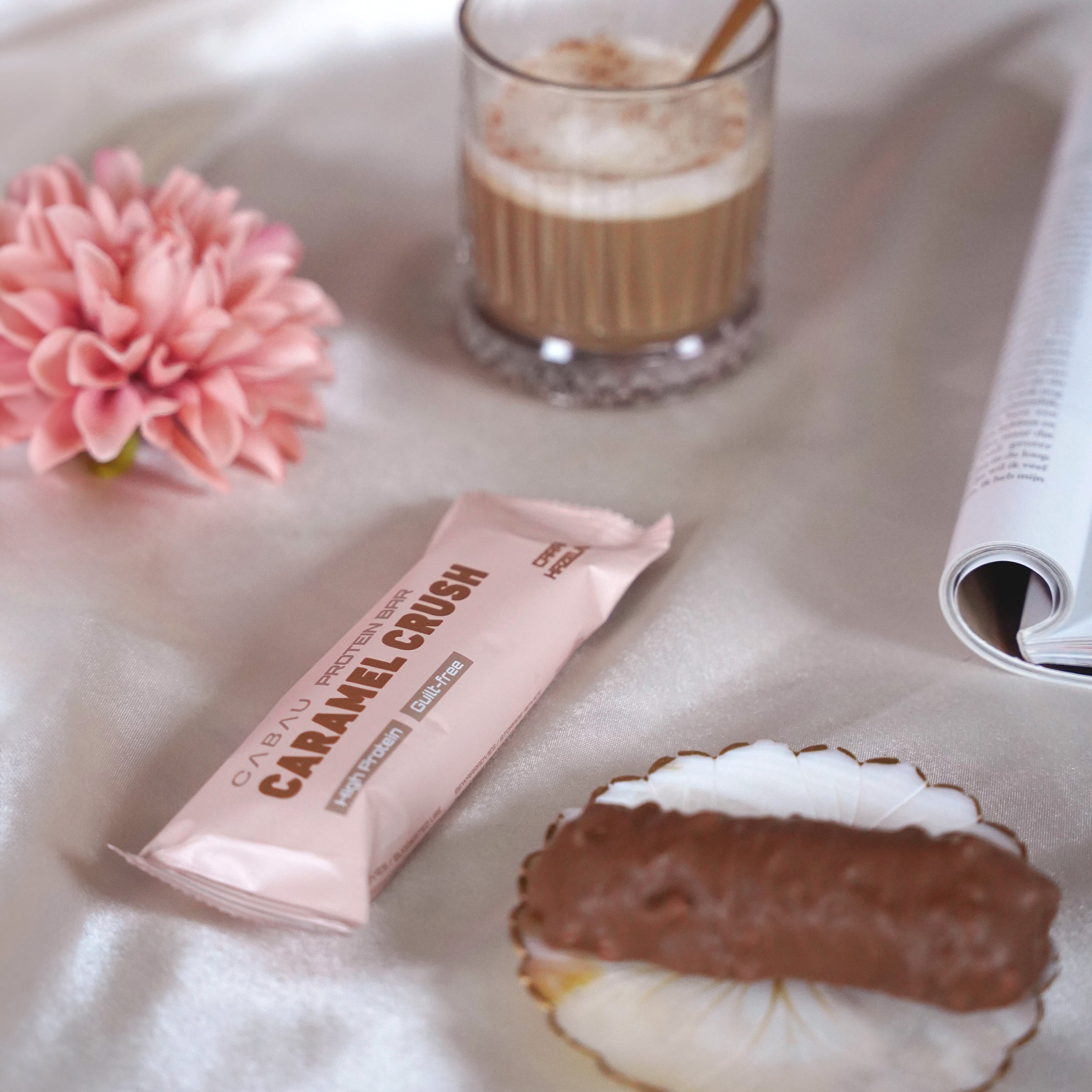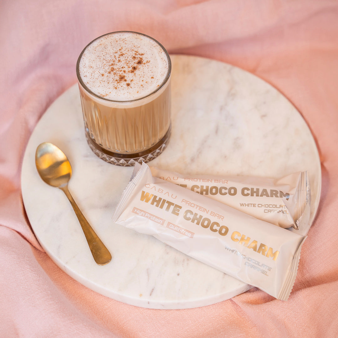 EN: white chocolate (sugar, cocoa butter, whole milk powder, emulsifier: soy lecithin, vanilla extract), chicory root fiber, milk protein protein, humectant: glycerin, milk protein concentrate, caramel pieces: (sugar, cocoa butter, rice starch, sea salt, raising agent: sodium bicarbonate), collagen peptides (bovine) , vegetable oil (coconut), caramel: (sweetener: maltitol syrup, cream (milk), humectant: glycerine, thickener: starch, milk, caramelized sugar, salt, natural flavouring, acidity regulator: citric acid), water, whey protein concentrate (milk) , sunflower oil powder (sunflower oil, modified starch, glucose syrup, silicon dioxide, natural flavouring), thickener: hydroxypropyl methylcellulose, natural flavouring, emulsifier: lecithin, sweetener: sucralose.