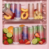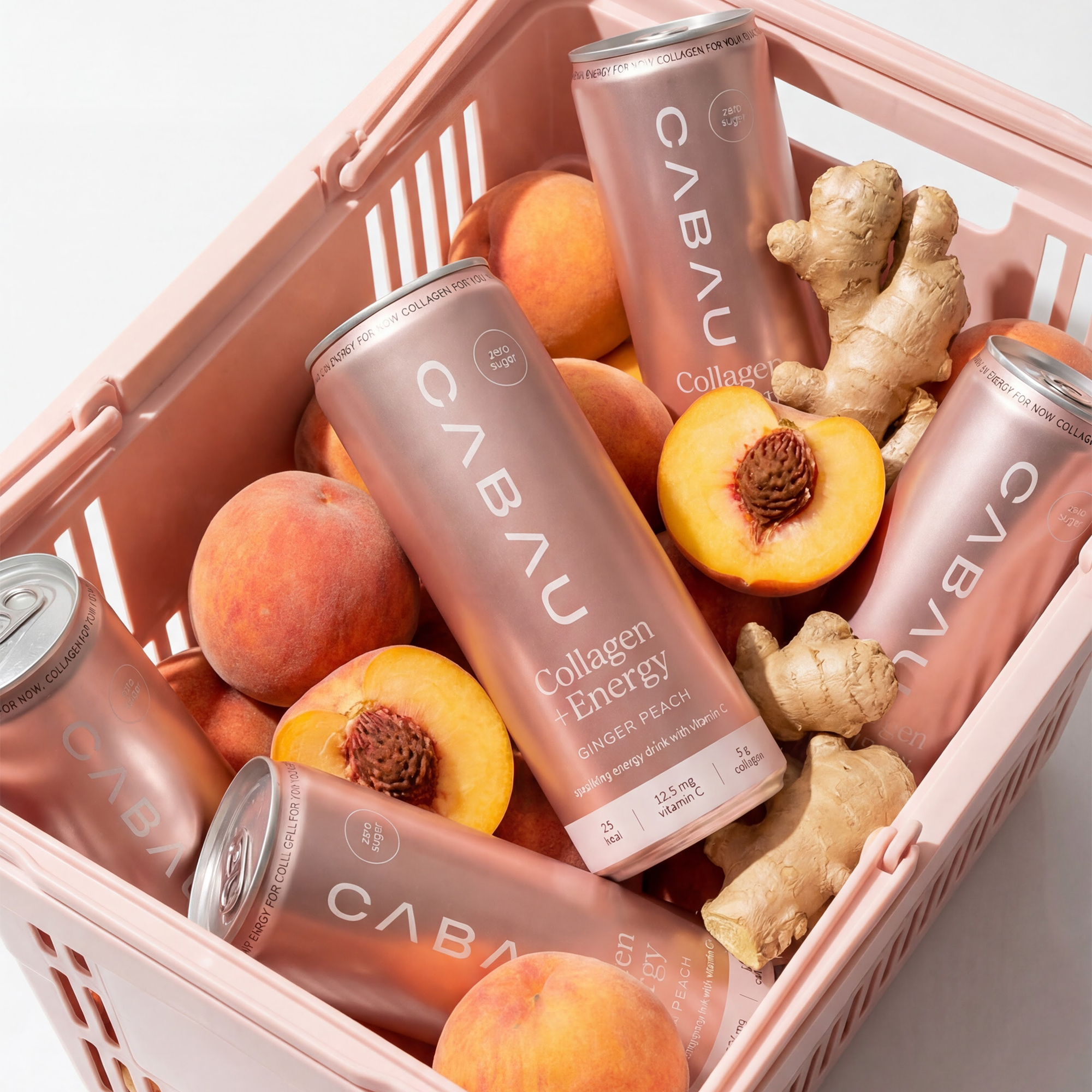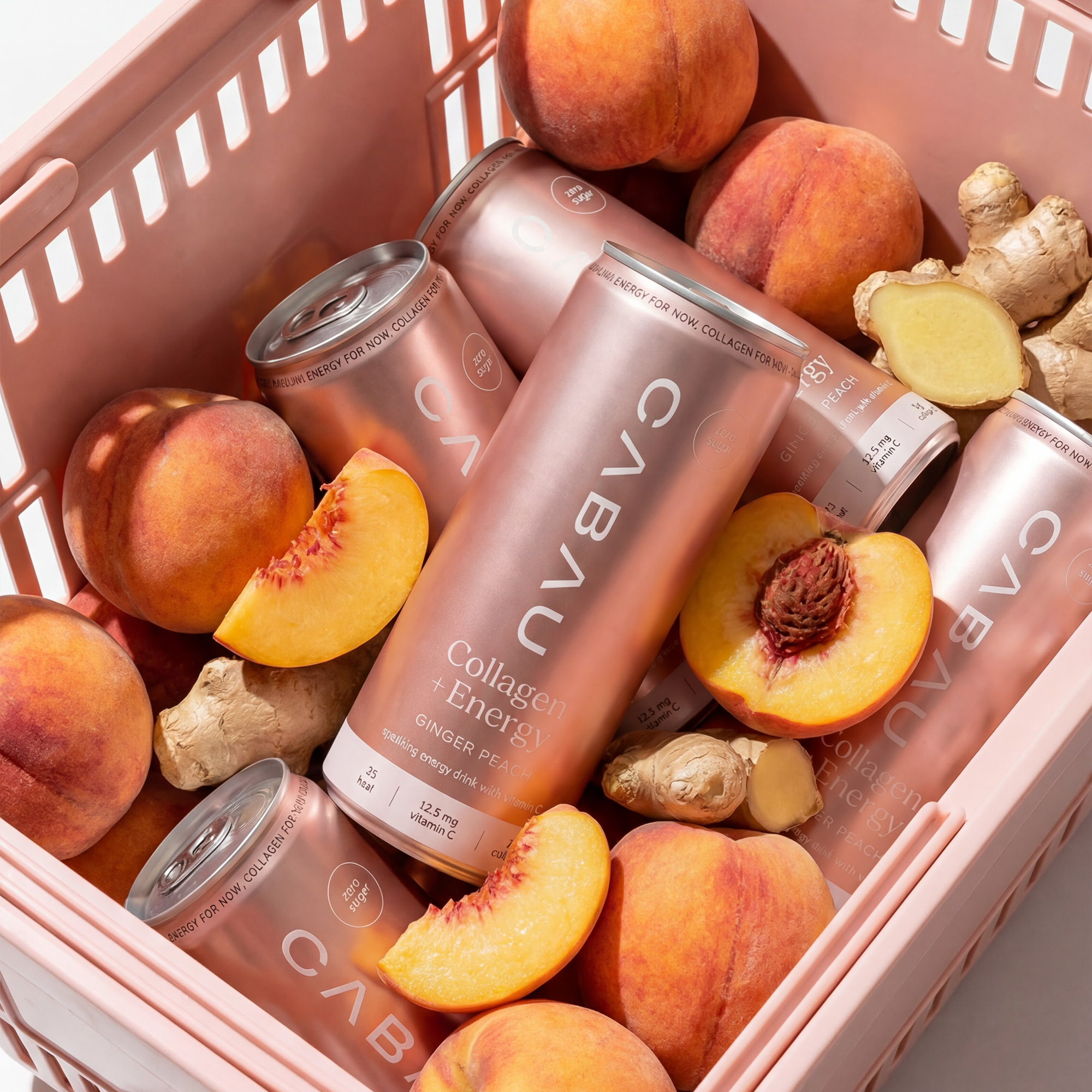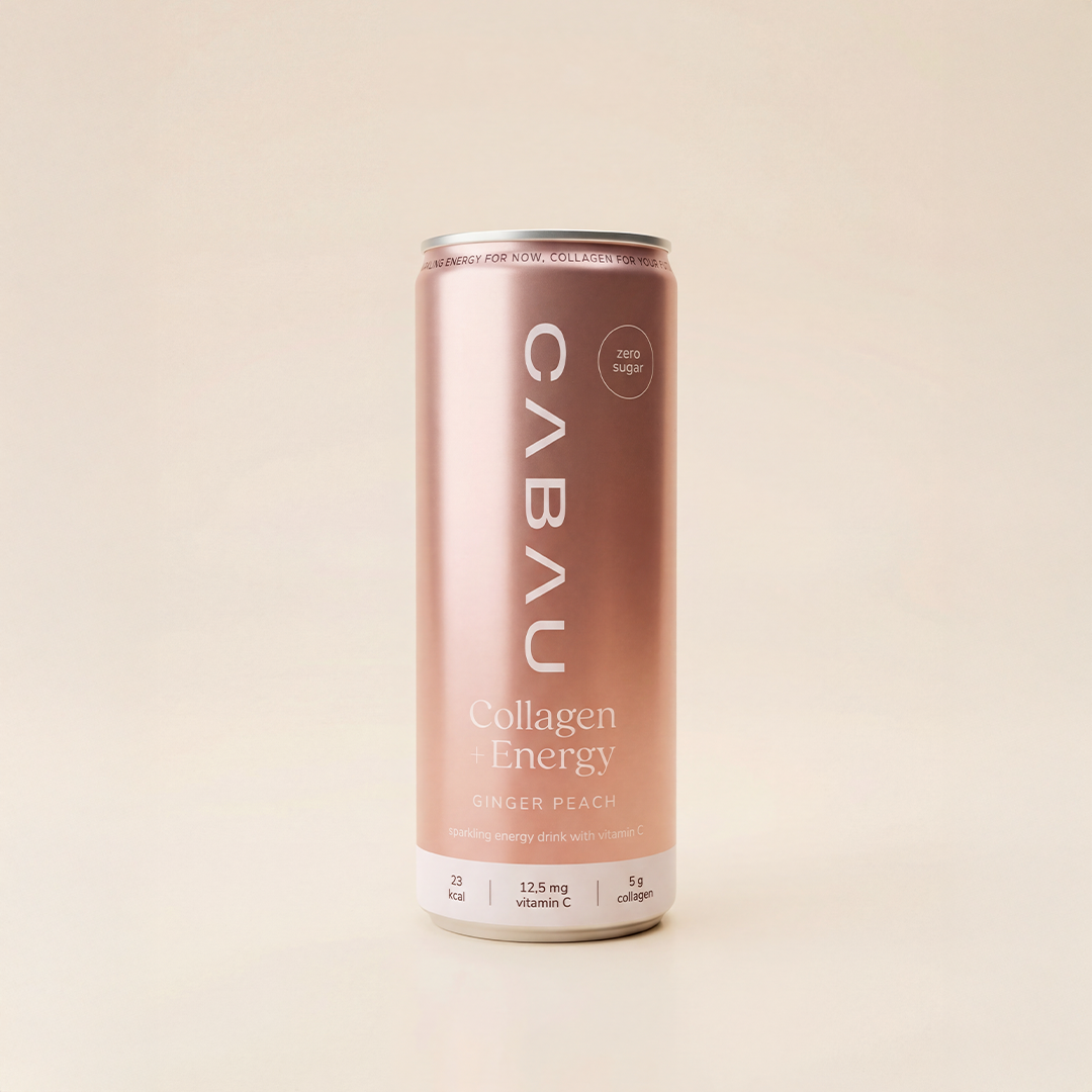 Carbonated water, marine collagen (fish), citric acid (E330), malic acid (E296), ascorbic acid (vitamin C, E300), flavourings (including peach and ginger flavour), caffeine flavouring, sweeteners: sucralose (E955), acesulfame-K (E950).