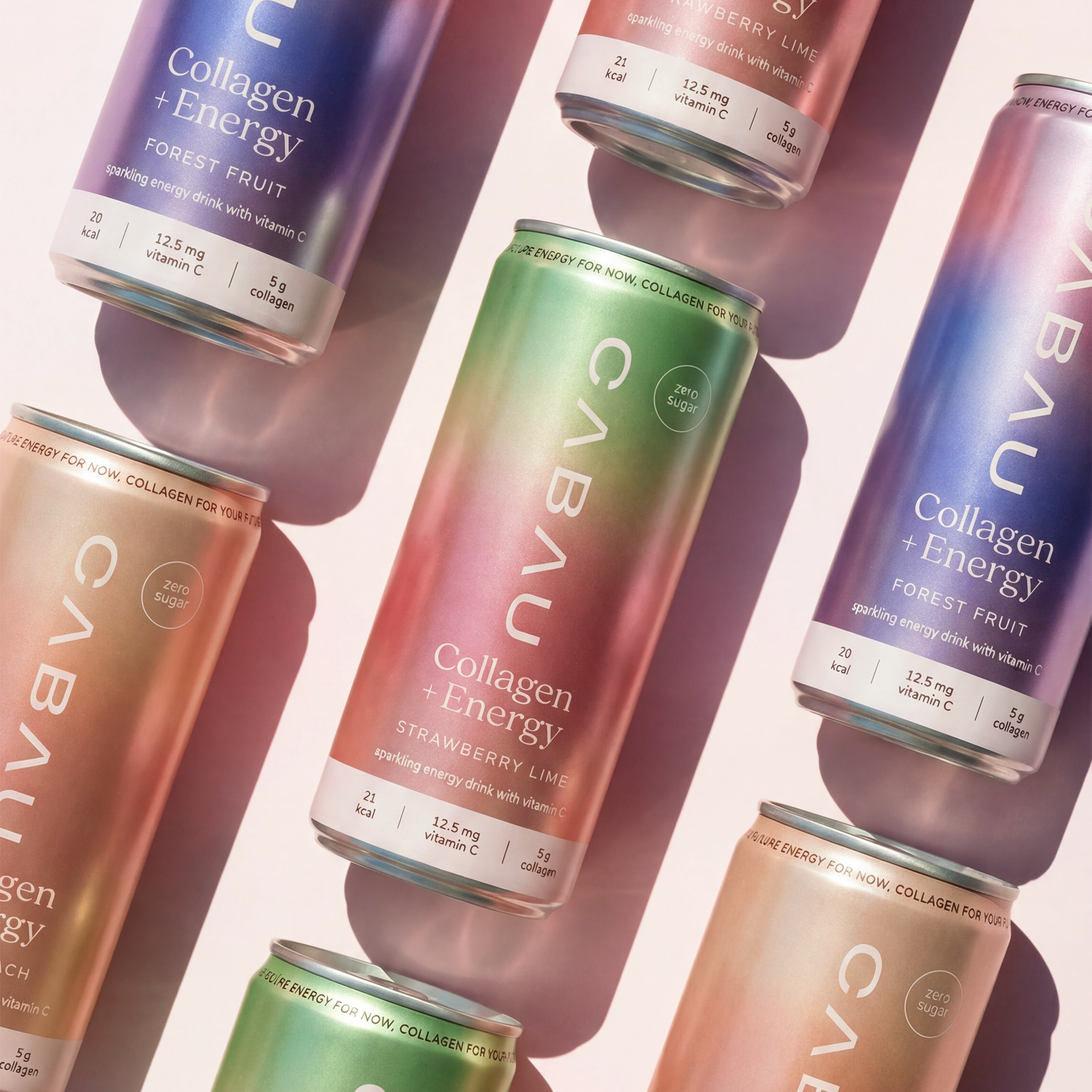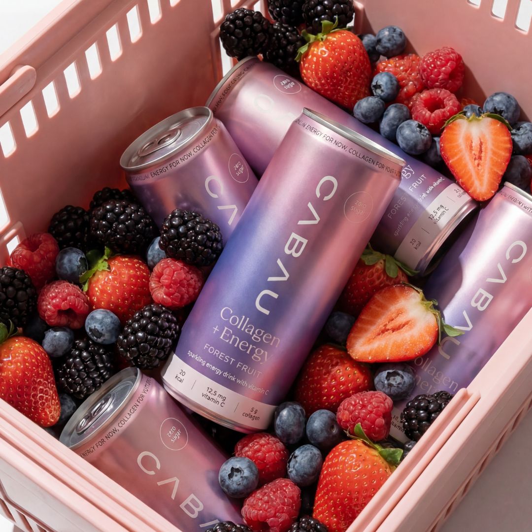 Carbonated water, marine collagen (fish), citric acid (E330), malic acid (E296), ascorbic acid (vitamin C, E300), flavourings (including blueberry and cherry flavour), caffeine flavouring, sweeteners: sucralose (E955), acesulfame-K (E950).