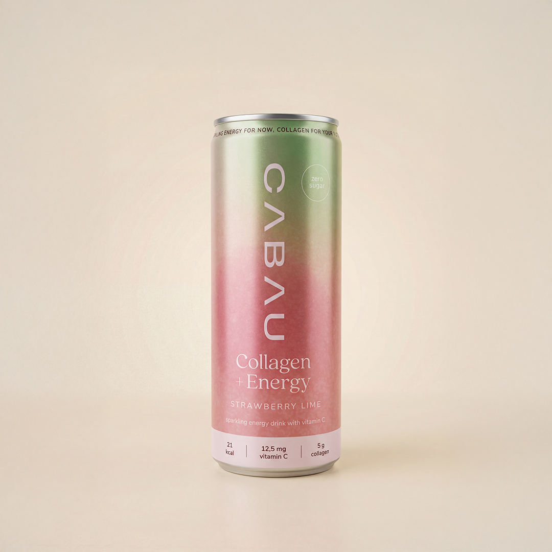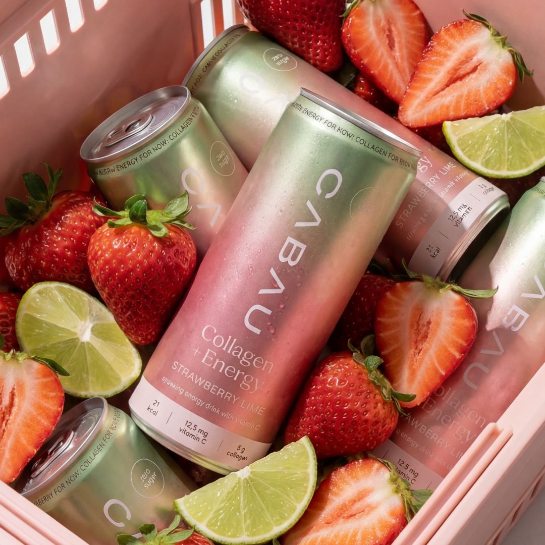Carbonated water, marine collagen (fish), citric acid (E330), malic acid (E296), ascorbic acid (vitamin C, E300), flavourings (including strawberry and lime flavour), caffeine flavouring, sweeteners: sucralose (E955), acesulfame-K (E950).